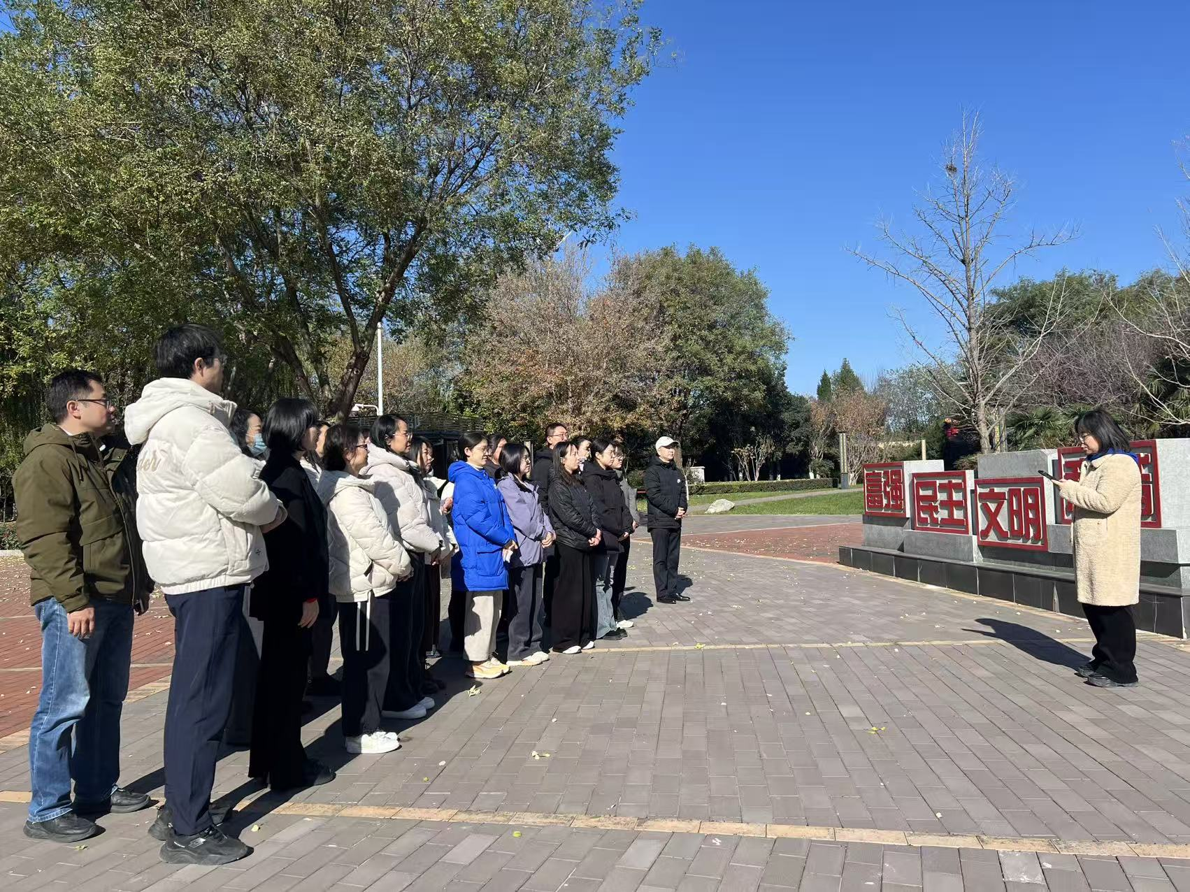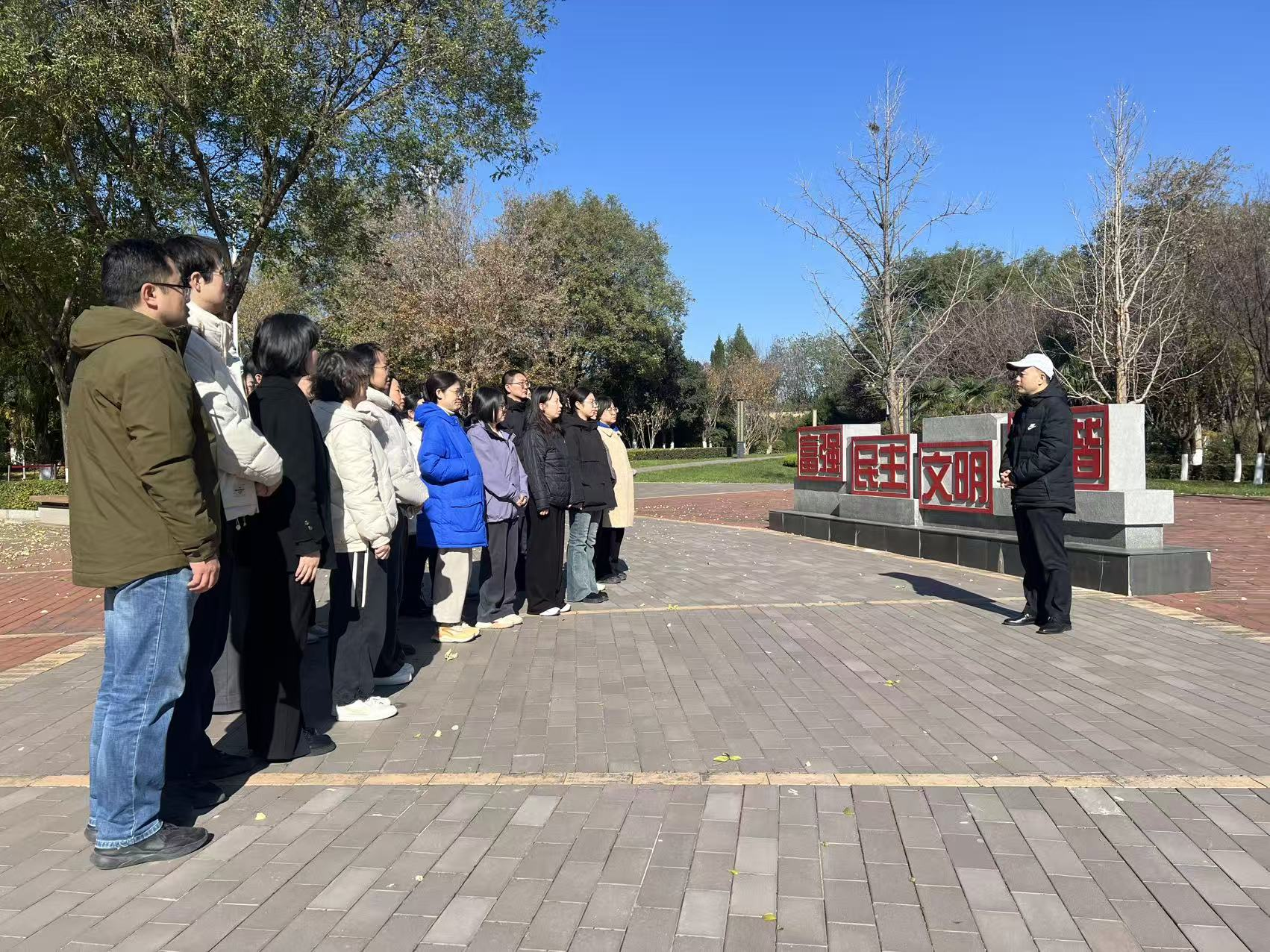 在陵园外,现场教学环节使活动内涵得到进一步深化。学院党总支副书记周晓华以“学习感悟习仲勋同志‘党的利益在第一位’的崇高风范”为主题,为大家讲授了一堂生动的微党课。他要求大家以习仲勋同志等革命先辈为榜样,始终牢记“党的利益在第一位”,不断加强党性修养,深刻理解党的二十届四中全会强调教育的“政治属性与战略属性”精神实质,践行“四有好老师”标准,当好学生成长的“大先生”。