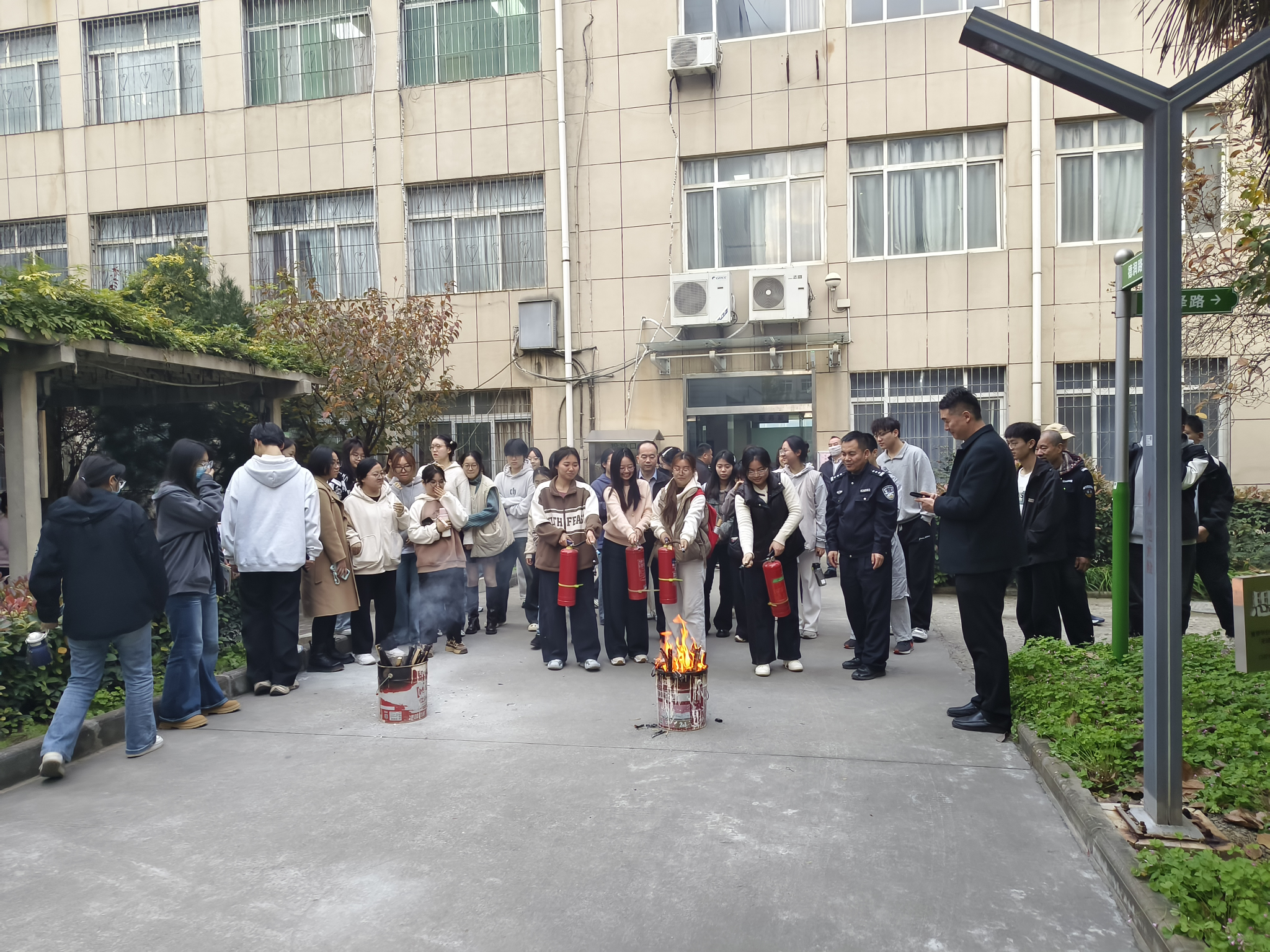 讲座结束,在高新校区中心花园旁空地,师生开展“119全国消防日”消防演练,通过保卫科老师讲解灭火器正确使用方法、民警现场指导、师生使用灭火器进行真实灭火演练,师生进一步熟练操作技巧,提升师生的消防安全意识和自防自救能力。