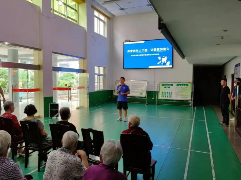 首先,暑期社会实践队成员肖东升进行了口腔健康知识的宣讲,以PPT文稿的形式向老人们集中科普了相关口腔卫生知识。他运用所学的口腔专业知识,通过生动形象的语言、简单易懂的示意图,向老年公寓的爷爷奶奶们普及口腔健康的具体要求和正确的刷牙方法,针对老年人牙齿保健的误区提出纠正,同时组织老人们观看了口腔健康宣传片,有效提高了老人对于口腔问题的认知水平和重视程度。