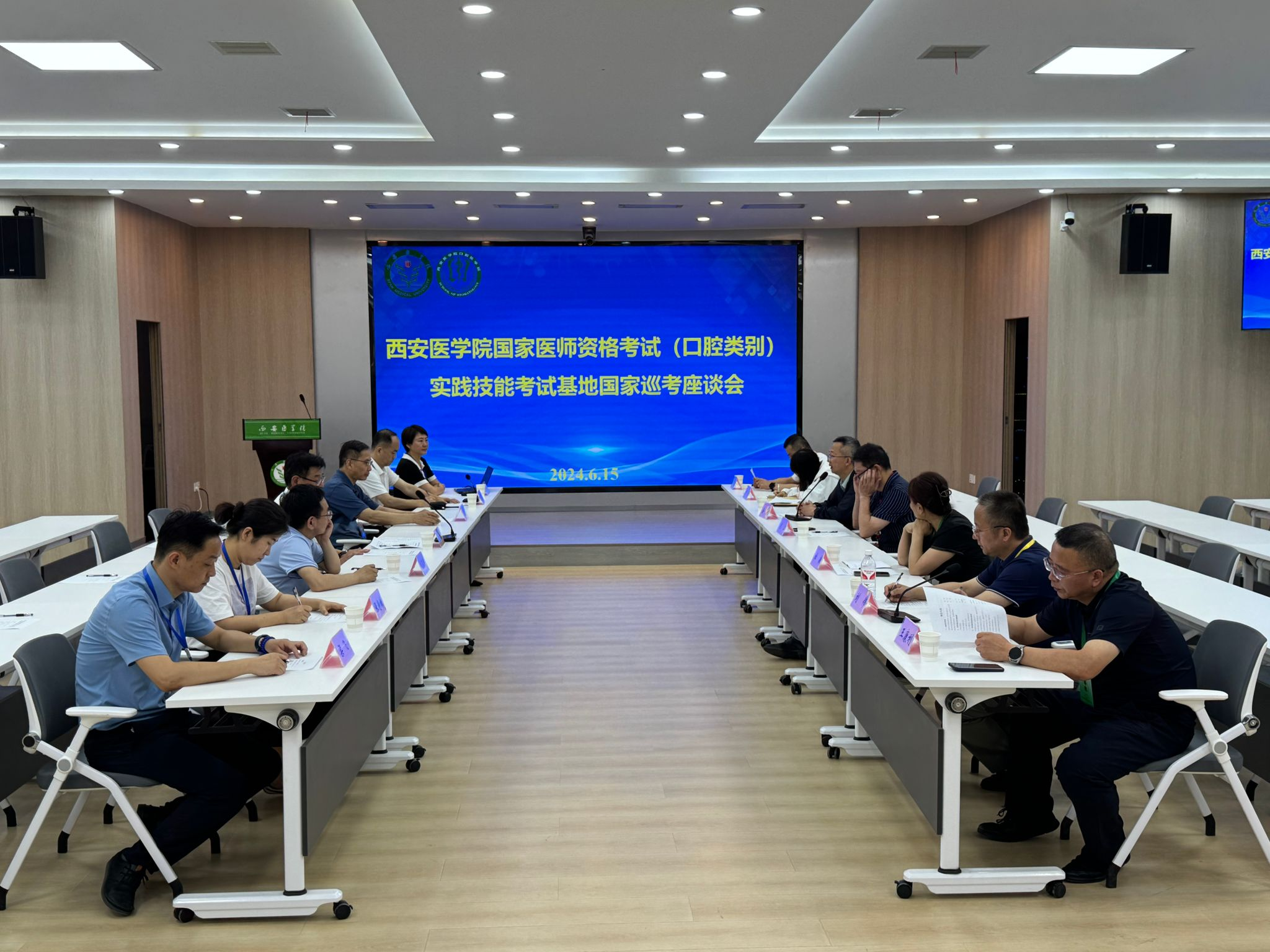 考试期间,国家医学考试中心陕西考区安涛组长、卢燕主任、重庆市疾病预防控制中心专家龙江,省卫健委二级巡视员杜敏、医政处督查专员刘伟、省人才外事中心主任王康利等专家和领导一行来院进行现场指导,巡视了考试全流程,并对考生入口、考场、保密室、成绩录入室等重点环节及人员进行了检查,详细了解考试组织实施情况。座谈会上,专家对我校基地考试工作给予了高度评价,认为基地运转流畅,可以媲美执考四、五年的老基地。
