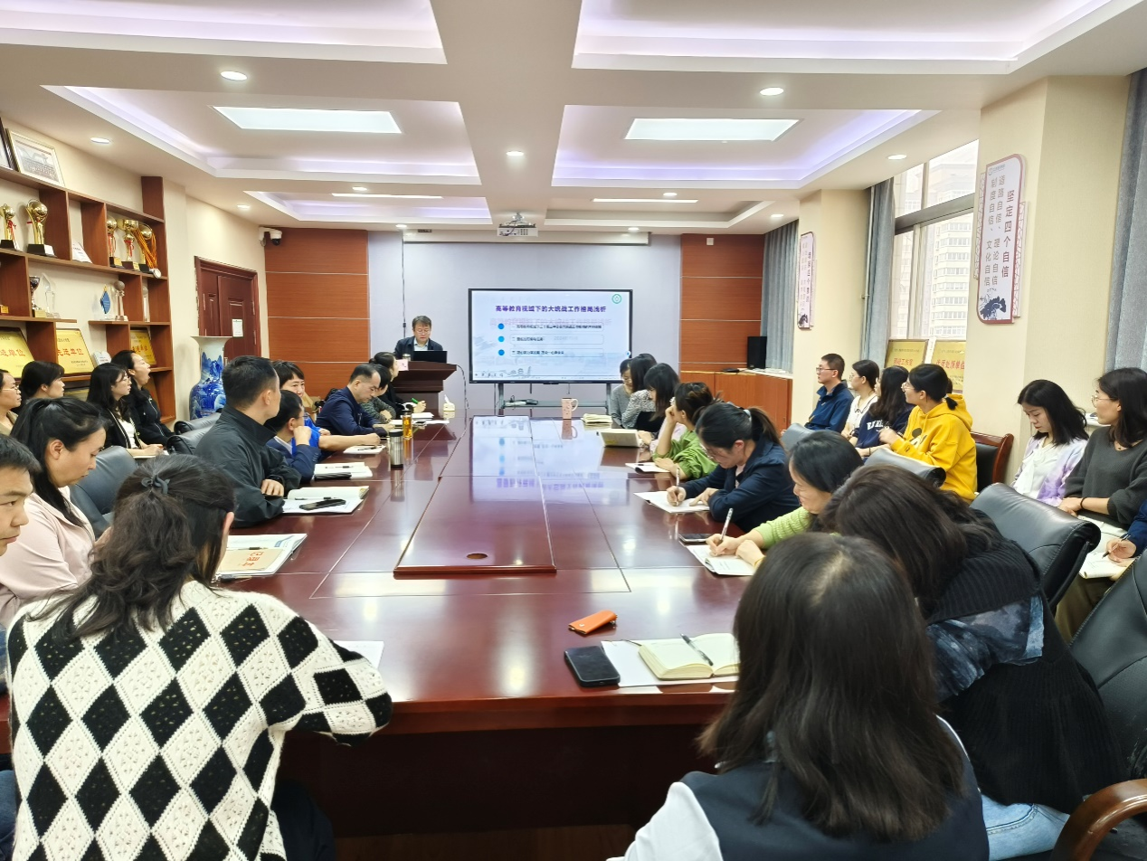 10月8日下午,学院联合校党委统战部在高新校区五楼会议室举办了“统战部长讲统战”专题讲座。校党委委员、党委统战部部长吴戈作《高校教育视域下的大统战工作格局浅析》讲座,学院全体教师到会聆听。统战委员周晓华主持讲座。