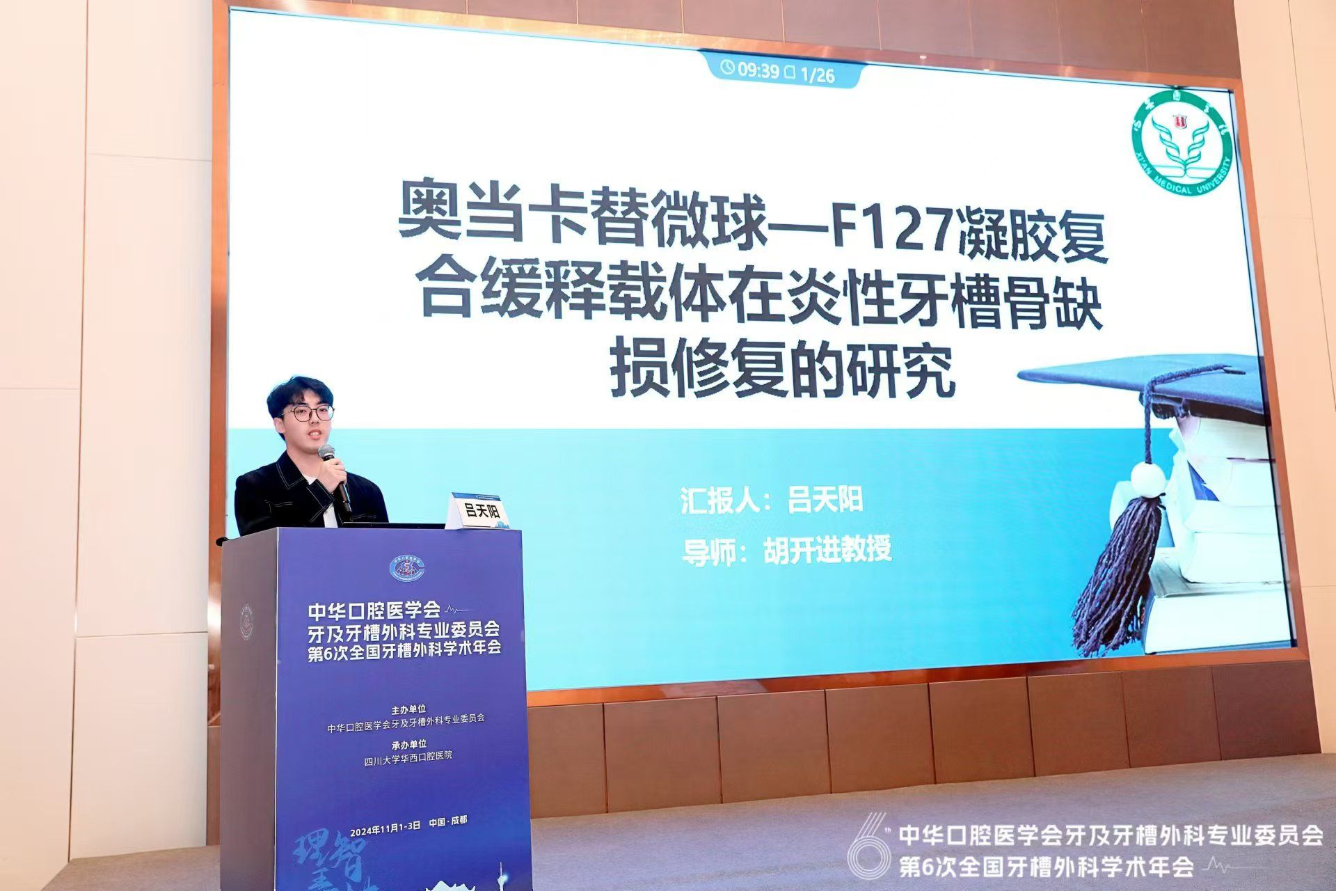 我院青年教师贾森作了题为《穿经埋藏牙种植20例总结(8个月至5年的随访)》的病例汇报,分享了穿经埋藏牙种植的随访数据和临床经验,并获得“弄槽青年优秀病例报告会”病例展示一等奖。我院学生吕天阳作了题为《奥当卡替微球——F127凝胶复合缓释载体在炎性牙槽骨缺损修复的研究》的报告,葛晓悦作了题为《不同年龄段内下颌阻生第三磨牙对自身及周围组织病变的影响》的报告。