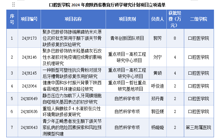 获批项目涵盖了基础医学、口腔材料学、口腔基础医学、口腔临床医学、卫生管理学等多个领域,体现了学院学科建设的全面发展和科研水平的整体提升。
