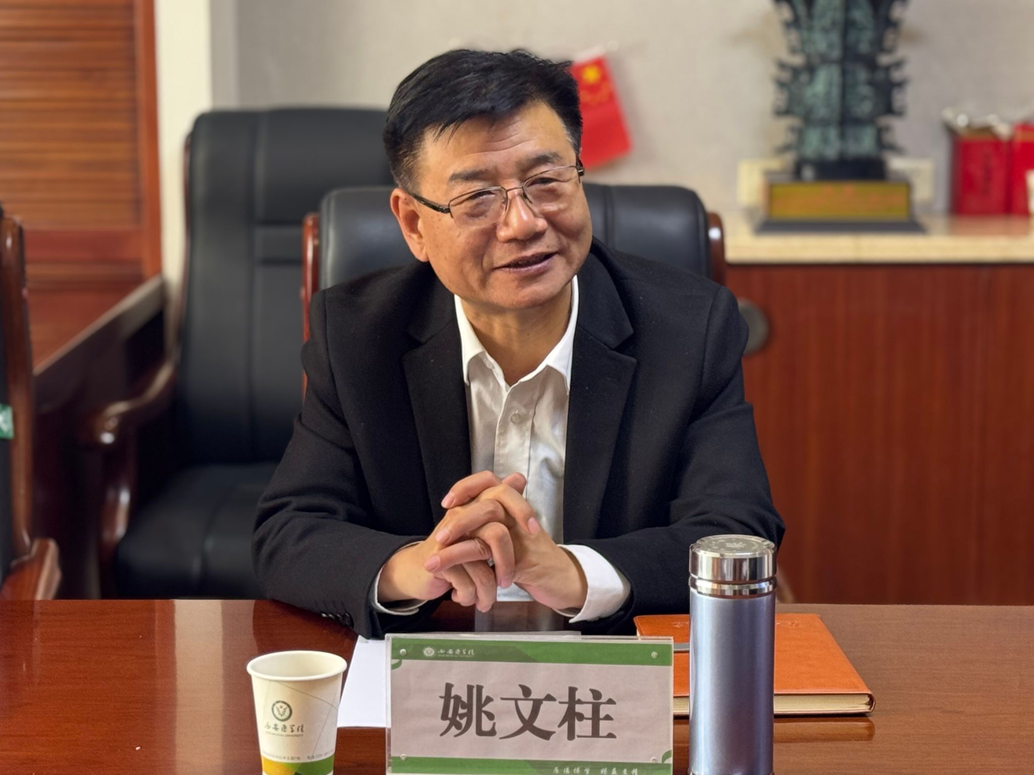姚文柱对蔡彬一行来访表示欢迎,并简要介绍了学校发展概况。他指出,目前学校深入贯彻党的二十届三中全会和全国两会精神,落实省委关于“三个年”活动要求,深化改革开放,通过实施“七个一”工程 “122计划”,持续推进内涵建设,不断提升学校综合实力和社会影响力,努力实现高质量发展。希望双方以此次座谈为契机,优势互补,加强合作交流。
