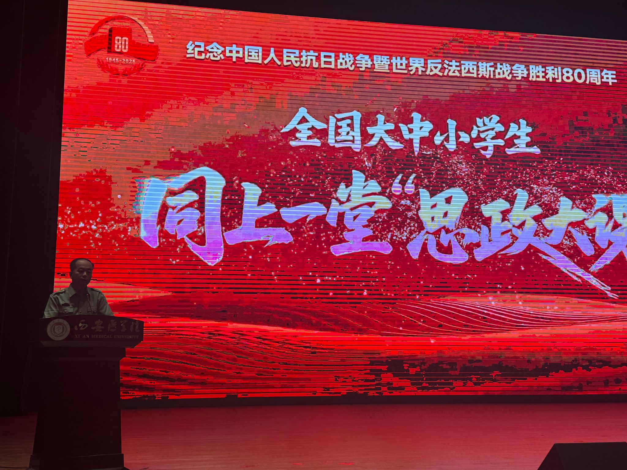 9月18日上午,在未央校区体育馆报告厅,学院2025级135名新生与全国大中小学生一起,同上由教育部、中央网信办、人民日报社、国家文物局联合主办的“弘扬伟大抗战精神 做光荣自豪中国人”思政大课。学院党总支副书记周晓华参与活动。